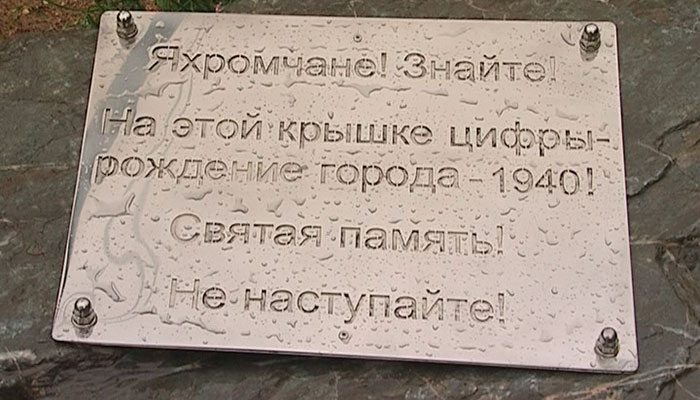 В минувшую пятницу в Яхроме был открыт необычный, скажем так, памятник. Усилиями местного композитора и краеведа Сергея Ситникова был сооружен памятный камень с надписью возле вот этой канализационной крышки. По словам яхромского краеведа, эта крышка – своего рода символ его родного города, ведь на ней выбита не только дата ее производства, — 1940 год, — но и дата основания Яхромы. Осенью 1940 года посёлок при суконной фабрике получил статус города. И эта яхромская крышка — немой летописец почти восьми десятков лет горя, радостей, достижений и разочарований живших и живущих здесь горожан! Она помнит, как в декабре 41-го немецкие пулеметчики стреляли из окон вот этого 6-го дома на улице Ленина по Перемиловской высоте. Помнит, как нацистов выбыли из города, и Яхрома стала первым советским городом, освобожденным от немцев. Помнит, как в 45-ом вернулись яхромчане-фронтовики с медалями и орденами на груди — и гуляли со своими родными вот по этой старой аллее. Несмотря на ливень, на открытие памятной доски у яхромской крышки, ровесницы города, пришли местные жители. Они вспоминали, кто жил на этой улице, как она менялась. Неизменной оставалась только эта крышка, ставшая уже давно одним из неофициальных символов Яхромы! Кстати, в этом доме номер шесть на улице Ленина жил Герой Советского Союза Петр Худов. Он работал помощником мастера на прядильно-ткацкой фабрике в Яхроме, потом окончил Качинскую военную авиационную школу пилотов — и героически проявил себя на фронтах Великой Отечественной войны, сбил лично 24 вражеских самолёта и 6 — в группе. Эта крышка помнит, как герой вернулся с войны, как его тут, на аллее яхромские ребятишки принимали его в почетные пионеры. Многое помнит этот символ Яхромы, хорошего и плохого, помнит, пока мы не забываем своего прошлого!