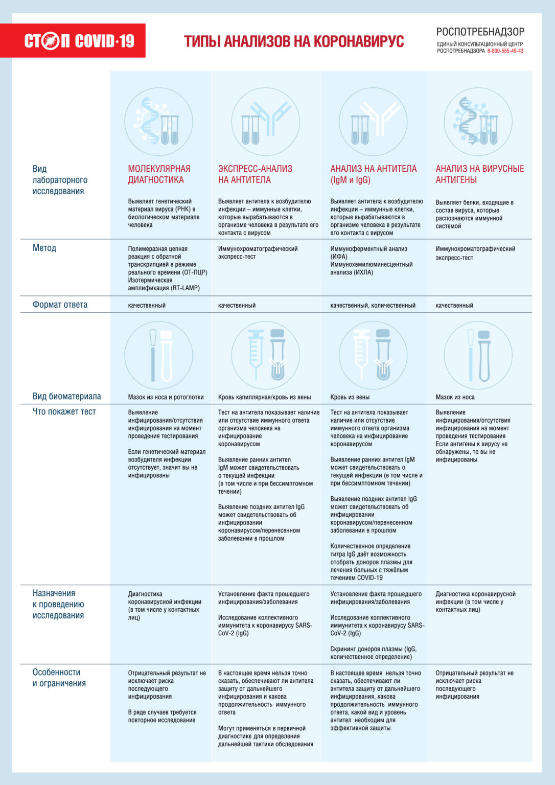 Сегодня наиболее актуальной задачей общественного здравоохранения является обеспечение безопасности населения Российской Федерации. С этой целью проводится массовое тестирование населения на коронавирусную инфекцию. Оно позволяет выявить как заболевших на ранней стадии, так и бессимптомных носителей. В настоящее время существует три вида исследований, у каждого из которых свои цели и назначения.