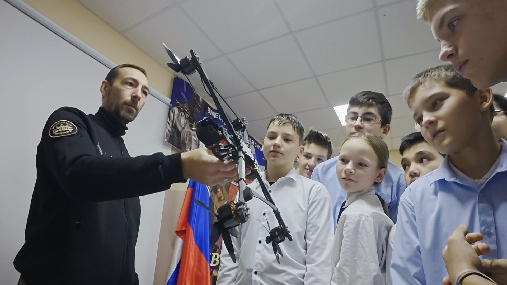 Гости прибыли не с пустыми руками: с собой они привезли амуницию, отечественное оружие и трофеи. Шлемы, бронежилеты, автомат, коптер и многое другое — каждый предмет мобильной экспозиции школьники смогли потрогать, примерить или даже разобрать. Именно эта часть занятия произвела на учащихся наибольшее впечатление.