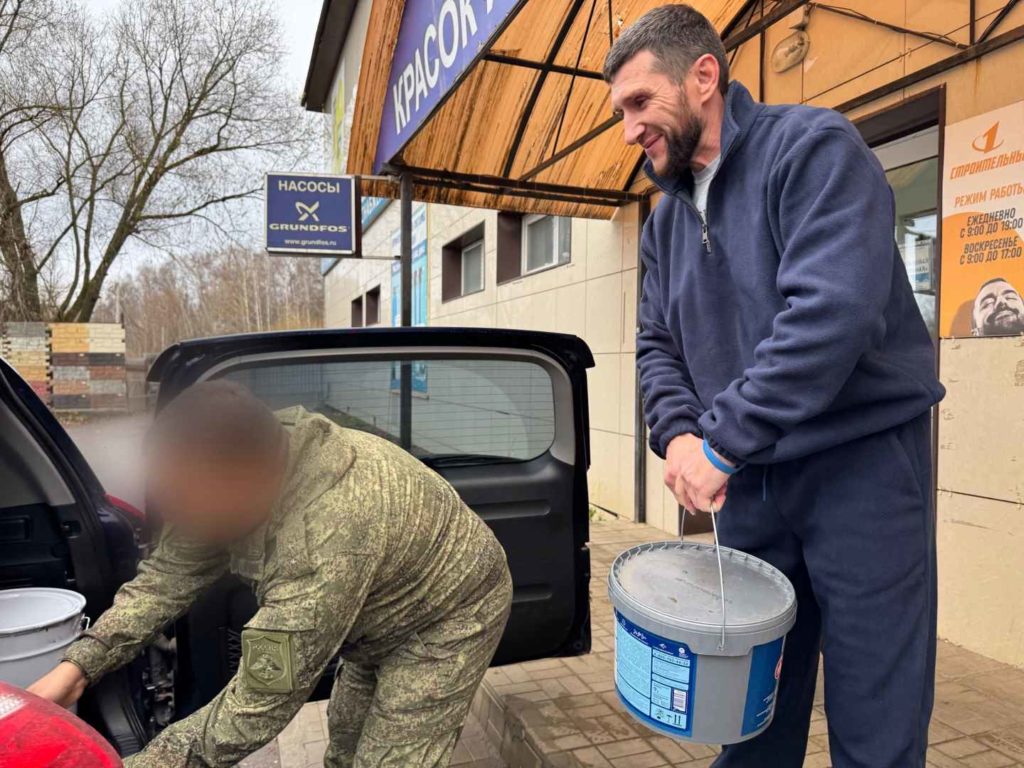 На этот раз по запросу военнослужащих директор магазина «1Строительный» Евгений Прокаев предоставил краску — фасадную и эмаль. Материалы необходимы для благоустройства и приведения полевых позиций в должное состояние.