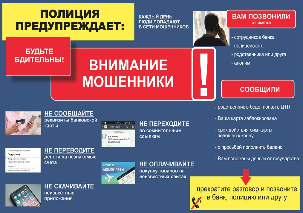 Мошенник представляется родственником (знакомым) и взволнованным голосом по телефону сообщает, что задержан сотрудниками полиции за совершение преступления. Далее в разговор вступает якобы сотрудник полиции, который сообщает, что уже не раз «помогал» людям таким образом. Но если раньше деньги привозили непосредственно последнему, то сейчас деньги необходимо привести в определенное место, передать какому-либо человеку, либо перевести на счет (абонентский номер телефона).