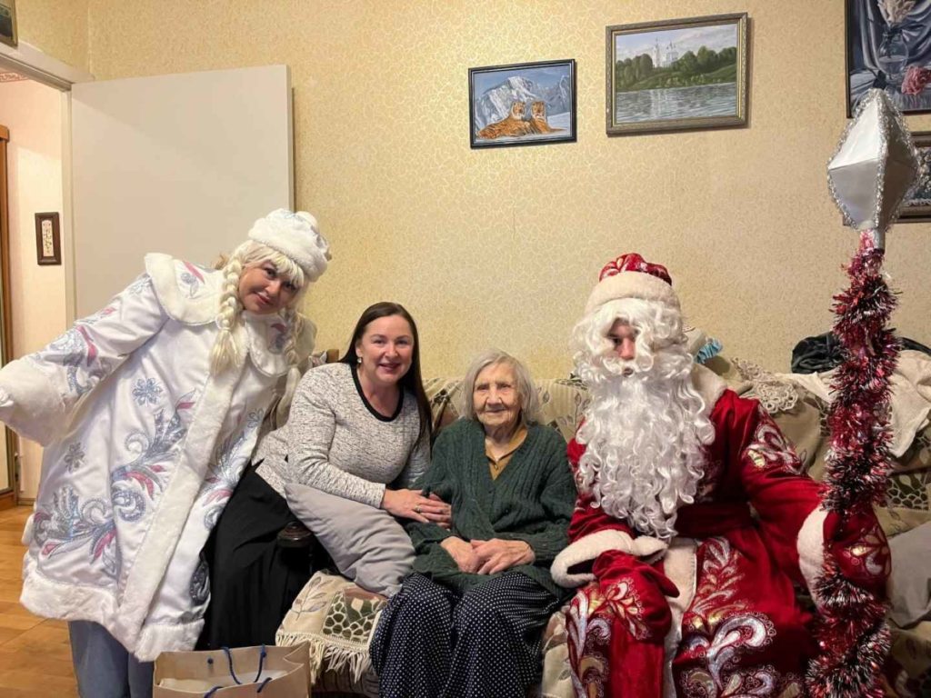 Поздравления героической жительнице Дмитрова принесли и сказочные новогодние персонажи. В роли Снегурочки выступила Александра Нечай, а в костюме Деда Мороза – активист «Молодой Гвардии».