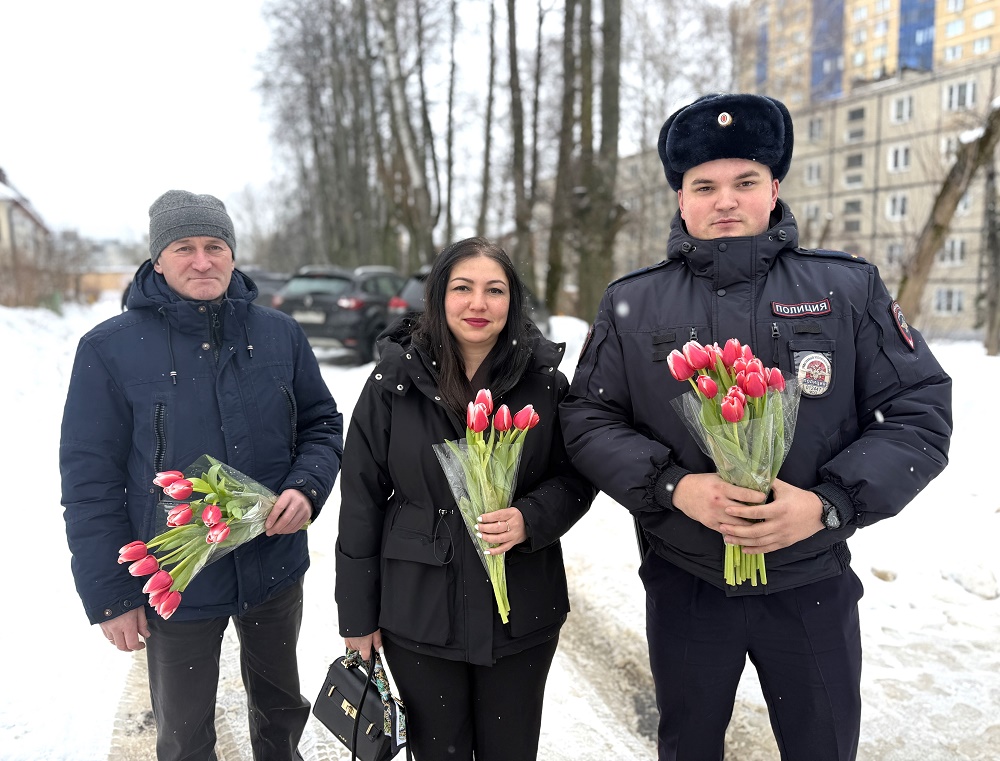 Сотрудники УМВД России «Дмитровское» и заместитель председателя Общественного совета Олег Белоусов присоединились к акции «8 Марта — в каждый дом».