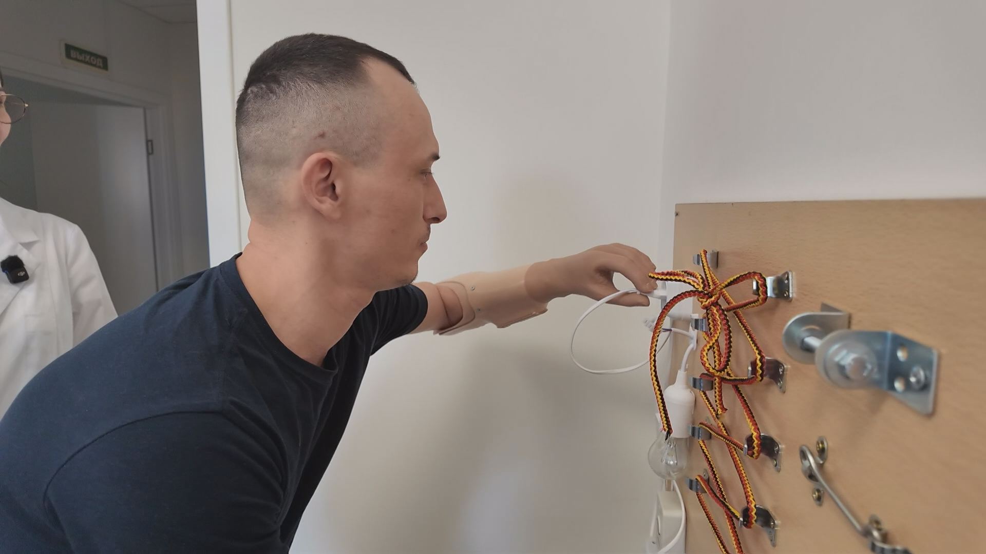 Для Михаила это первое рукопожатие после установки протеза. Сейчас для него многое впервые. Заново приобретает навыки, которые в обычной жизни мы совершаем автоматически. В центре протезирования и реабилитации, отрытом на базе Яхромского филиала Дмитровской больницы, как одна из локаций для функциональной адаптации — кухня, полностью продуманная под пациентов. Пациенты — бойцы специальной военной операции, которые в ходе выполнения боевых задач потеряли конечности. В центре им устанавливают современные бионические протезы. Михаил впервые пробует открыть окно. Видно, что нелегко, но сила воли и огромное желание побыстрее стать с протезом единым целым ему помогают. Методист по функциональной адаптации и эрготерапии, ЛФК – реабилитолог, клинический психолог Лилия Важова таких старательных пациентов хвалит.Максимум усилий к процессу адаптации прикладывает и Павел. Сейчас он впервые осваивает бизиборд – специальная панель, которая помогает развивать мелкую моторику. Павлу эти навыки очень важны, до СВО он занимался художественной ковкой. Хочет возобновить это занятие. Руку Павел потерял во время штурма. Первые ощущения после установки протеза у большинства пациентов одинаковые – «как – то непривычно» — говорят они. Вот чтобы вернуть это состояние привычности, бойцы много занимаются. В центре протезирования и реабилитации созданы все условия, для того, чтобы бойцы смогли вернуться к нормальной жизни. Глава Дмитровского муниципального округа Михаил Шувалов посетил центр протезирования и реабилитации. Специалисты рассказали и показали с чего начинается процесс создания протеза. Весь этот процесс смело можно назвать высокотехнологичным. В результате пациенту устанавливается современный протез идеально подходящий именно ему. Параллельно, пациенты проходят специальные программы ЛФК – реабилитации и работают с психологом. Глава округа пообщался и с бойцами, которые еще только в ожидании протезов, но уже морально готовые к новой жизни.