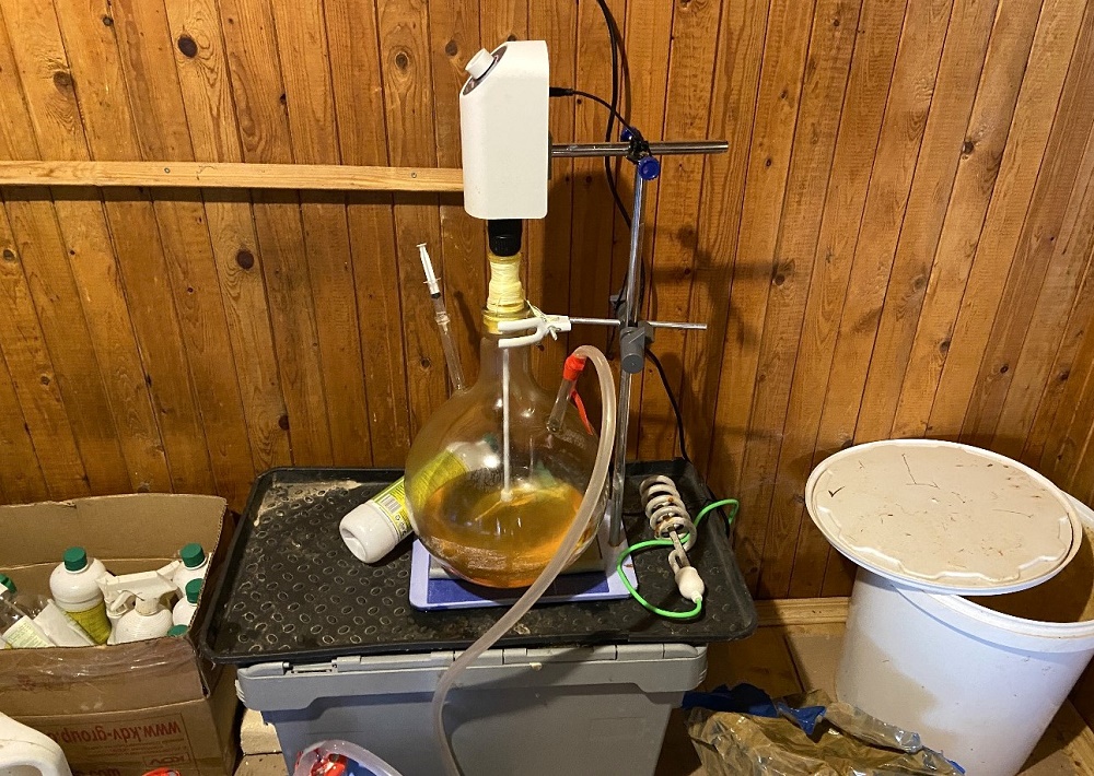 При производстве обыска оперативники обнаружили и изъяли вещество, используемое для производства наркотиков, 29 пластмассовых бутылок различного объема с химическими жидкостями и специальное лабораторное оборудование.
